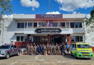 พ.ต.อ.สมชัย มงคลวงษ์ ผกก.สภ.บ้านโคก พ.ต.ท.ชูชาติ แก้วเรือง รอง ผกก.สส.ฯ พ.ต.ท.ภูวดล จันทร์อำไพ สวป.ฯ พร้อมข้าราชการตำรวจ สภ.บ้านโคก สนธิกำลังร่วมหน่วยงาน/เจ้าหน้าที่ (ร้านสะดวกซื้อ หมู่ 2 ต.บ้านโคก)/เจ้าหน้าที่ (รพ.สต.บ้านโคก)/เจ้าหน้าที่ (กู้ภัย บ้านโคก)