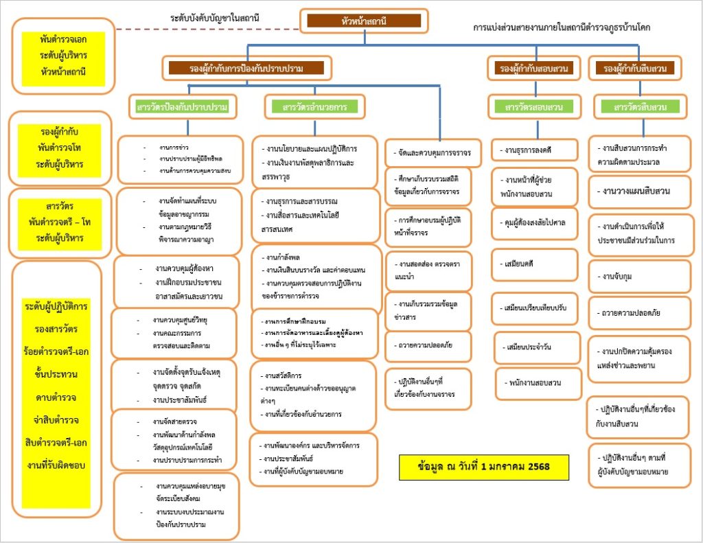 1) งานอำนวยการ มีหน้าที่เกี่ยวกับการอำนวยการ การวางแผน การตรวจสอบติดตามและประเมินผลงานที่เกี่ยวกับนโยบาย ยุทธศาสตร์ และแผนงานของสถานีตำรวจ งานการบริหารบุคลากร งานจเรตำรวจงานกิจการพิเศษ งานความมั่นคง การศึกษา การฝึกอบรม งานวิชาการ สวัสดิการ การพัฒนา การบริหารจัดการ งบประมาณ การเงิน การพัสดุ การพลาธิการและสรรพาวุธ การส่งกำลังบำรุง รวมทั้งลักษณะงานอื่น ๆ ที่เกี่ยวข้องหรือเป็นส่วนประกอบของงานดังกล่าว เพื่อส่งเสริมหรือสนับสนุนการปฏิบัติงานของสถานีตำรวจ